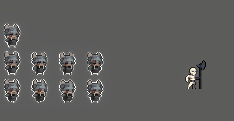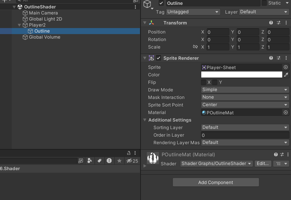 원래라면 기존 스프라이트에 메테리얼을 적용시키면 하나의 스프라이트 렌더러로 테두리까지 그려지는 거였다. 하지만 유니티 2D 스프라이트가 어째서인지는 모르겠으나 문제가 생기는 경우가 있어, 따로 자식 오브젝트를 하나 더 만들어서 Outline용 스프라이트 하나 더 사용하는 식으로 제작하였다.